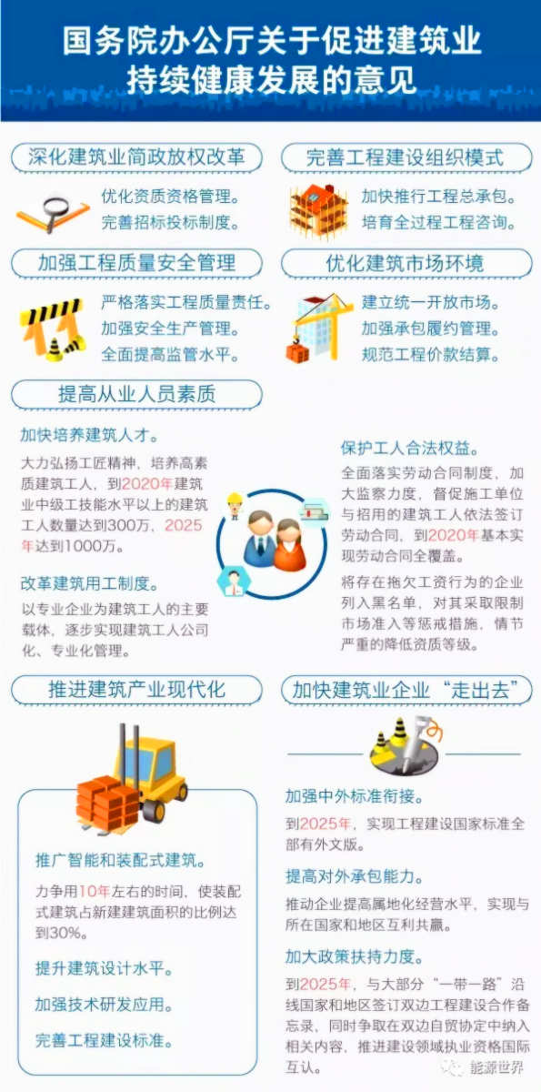 党中央、国务院高度重视建筑业改革发展,为解决上述问题,国务院办公厅印发了《关于促进建筑业持续健康发展的意见》(国办发〔2017〕19号),这是建筑业改革发展的顶层设计,从深化建筑业简政放权改革、完善工程建设组织模式、加强工程质量安全管理、优化建筑市场环境、提高从业人员素质、推进建筑产业现代化、加快建筑业企业“走出去”等七个方面提出了20条措施,对促进建筑业持续健康发展具有重要意义。